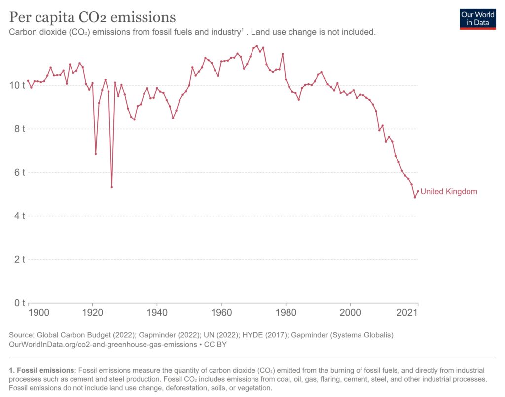 As our leaders bicker over how fast Britain should get to Net Zero, you’ll hear politicians, eco-zealots and media pundits claiming that Britain is leading the world in reducing our country’s CO2 emissions. This is one of the few statements about climate made by our ruling elites which does actually appear to be true. Since 1990, Britain’s CO2 emissions have almost halved from 604 million metric tons to just under 350 million tons by 2022. That equates to a drop from 10 metric tons per capita in 1990 to below five tons per capita: