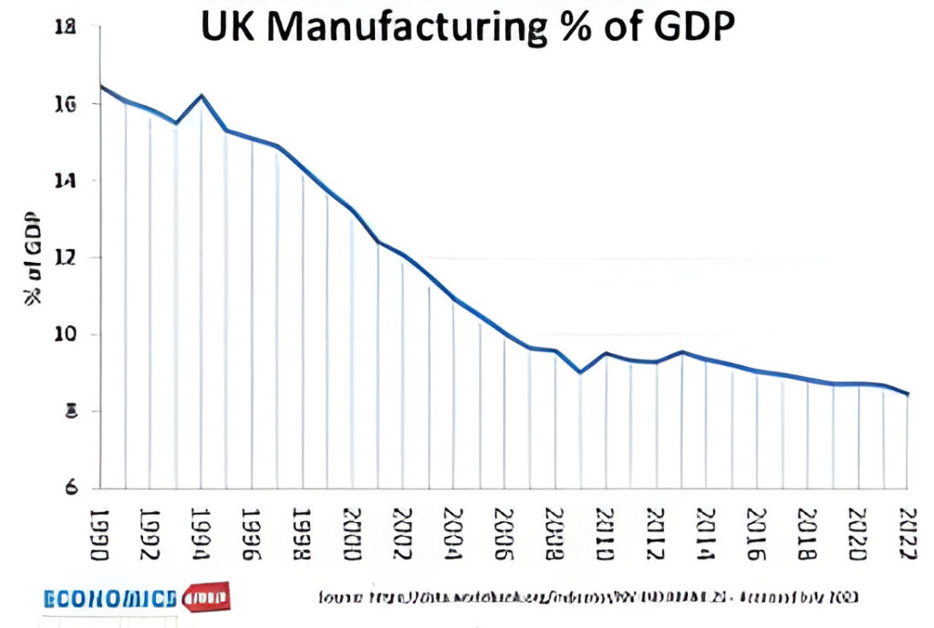So, just to put all of this into context, we can look at how much of the U.K.’s GDP comes from manufacturing – making real things that people in Britain and abroad want to buy – compared to our major competitors. In 2022, 8% of the U.K.’s GDP came from manufacturing compared to 9% for France, 12% for the U.S.A., 13% for India, 14% for Italy, 18% for Germany and a massive 28% for China.
