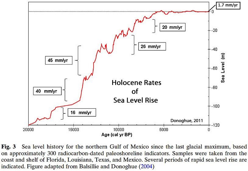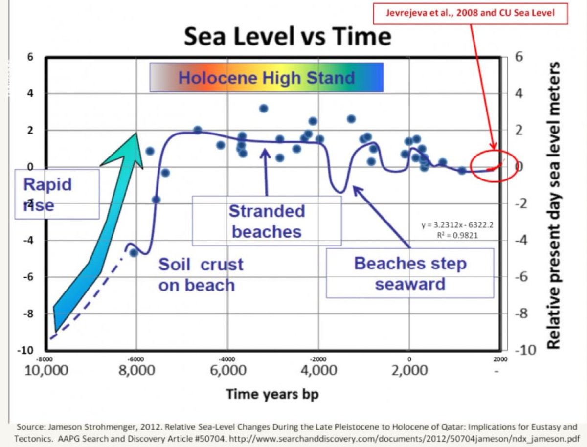 The Western Isles are not a good example, as the land in Scotland has risen due to isostatic rebound after the ice age. I was talking about the global mean sea level. Also your first graph is of the Gulf of Mexico and illustrates one of my points about 20000 years of sea level rise. The second graph is of Qatar. The graph’s paper ‘s abstract states “”Early Holcene suggest rapid rates of tectonic uplift…”, so presumably isostatic changes, although I think one can get localised sea level drops- not my area of expertise so I don’t know.