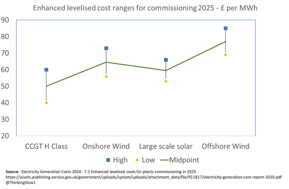 It is plain to see that gas (CCGT) is the cheapest form of electricity generation on an enhanced levelised cost basis even when accounting only in this partial way for downstream network costs.