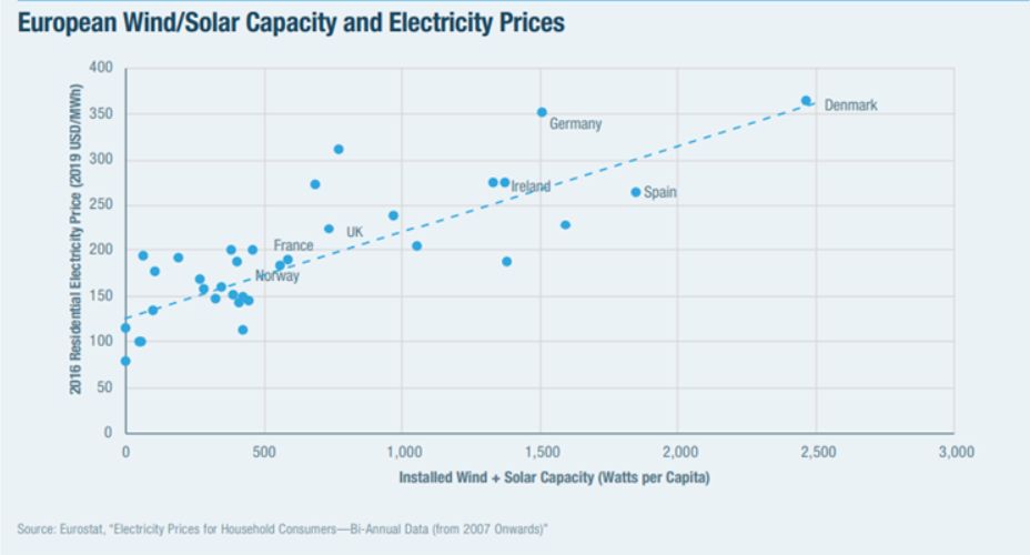 Observed data is always the acid test and in an excellent report by Mark P. Mills from the Manhattan Institute, he includes a chart of residential electricity prices versus wind and solar capacity per capita across European countries. Doubtless there may be some cofounding factors, but overall the trend is crystal clear: more ‘cheap’ renewable energy is directly linked to higher residential energy prices. Very much as we expected and the opposite outcome to that promised by the U.K. politicians.