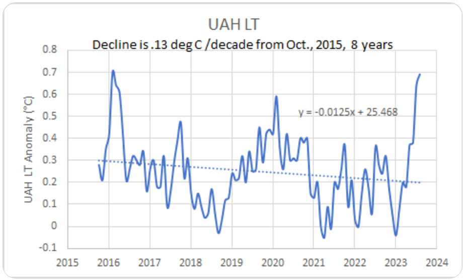 The above graph, recently tweeted by the science writer Andy May, demonstrates how unscientific the use of individual outliers to prove a doomsday prediction can be. It shows the global temperature measured by satellites since 2015, and reveals a small downward trend over the last eight years. But there are departures from the norm, both higher and lower over the period including a spike upwards this year. When doomsters start to catastrophise the heat spikes but ignore the trend, it is time to start counting the spoons. When the Guardian runs a front page story titled ‘“Gobsmackingly bananas”: scientists stunned by planet’s record September heat‘, it might even be time to call for the men in white coats.