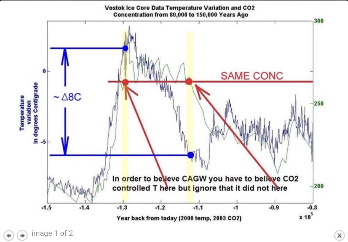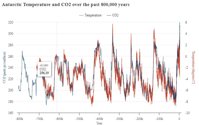 Indeed. When I was at UEA nearly a couple of decades ago it was known as the “flat beer” model. If you have an unopened can of beer then when it is cold in the fridge the carbon dioxide in the space above dissolves into the beer; when you warm it up the carbon dioxide moves back into the space. (It is related to Henry’s Law.) In the Antarctic Ice cores the concentration of carbon dioxide and the [proxy for the] temperature were measured over a period of around 800,000 years. It was found that temperature changes preceded carbon dioxide changes by a few hundred years. Therefore it could not be the case that carbon dioxide changes were causing temperature changes, as cause must preceded effect.