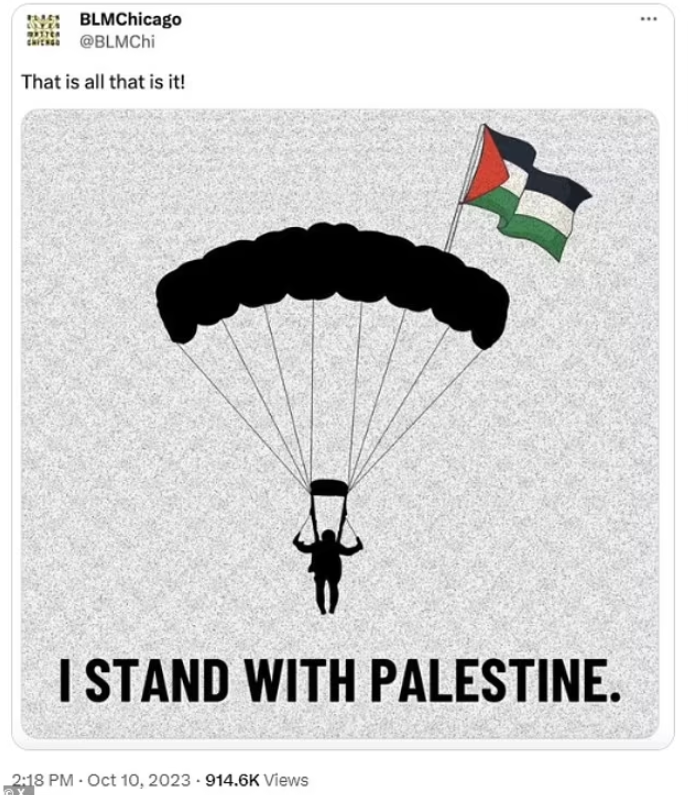 The Black Lives Matter chapter in Chicago publicly backed the Palestinian terrorists who killed some 1,200 Israelis over the weekend with a post that read “I Stand with Palestine” and an image of a Hamas paraglider. The Mail has more.
