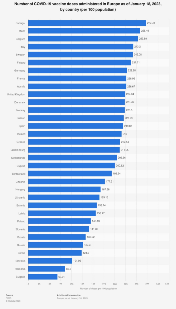 But sceptics of the Covid measures have been spectacularly wrong-footed in citing such data, since if Sweden did indeed resist lockdown, it by no means resisted mass vaccination. As the below Statista graph illustrates, Sweden in fact had one of the highest COVID-19 vaccination rates in Europe.