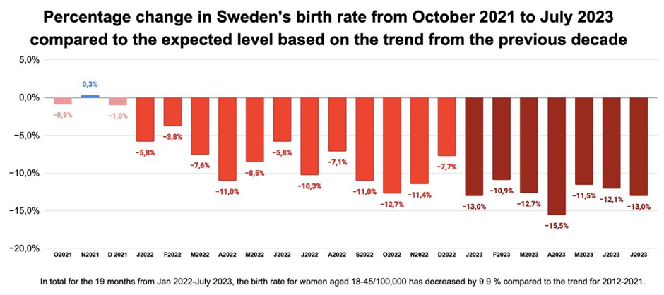 “Swedish birth rates have been below the prior 10-year average for no less than 19 months now and the Swedish birth shortfall has got progressively worse, reaching a low of minus-15.5% in April of this year.”