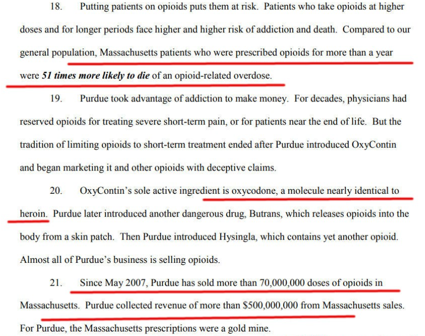 The story of Purdue Pharma – its relentless push towards higher doses of opioids given to patients to get them addicted – is much longer than the story of the Covid vaccines. This post is not the best place for a comprehensive history. The best quick introduction to the malfeasance of the Sackler family that owned Purdue Pharma is to read the PDF of the Massachusetts legal complaint.