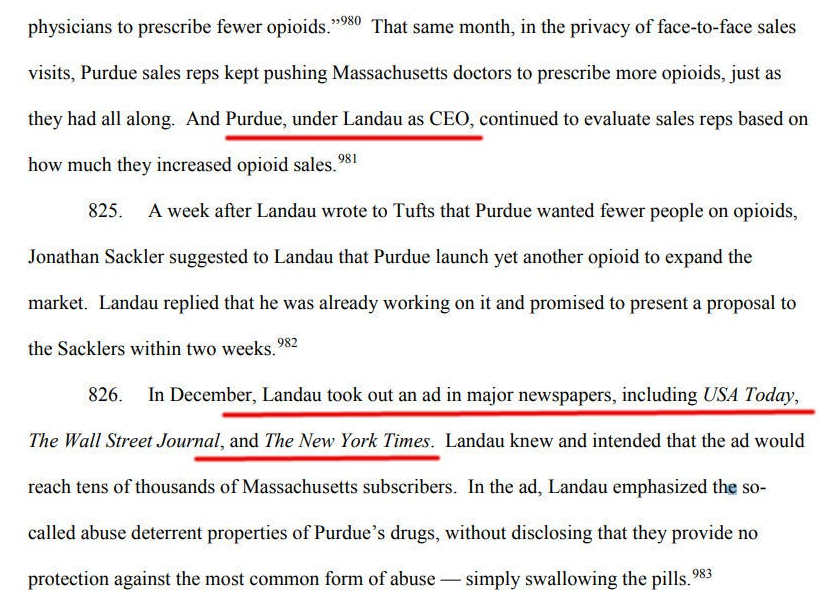 As Massachusetts’s legal complaint explains, Purdue Pharma was paying the New York Times for advertising: