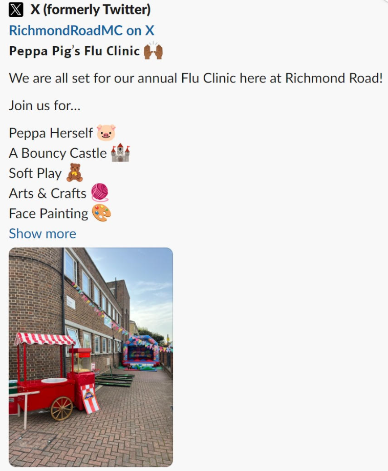 Further investigation revealed that the Richmond Road Medical Centre’s Peppa Pig Flu Clinic has been running since 2021, with a post promoting the 2021 clinic on the GP practice’s Facebook page and this 2022 clinic highlights video and event update below posted on their website: