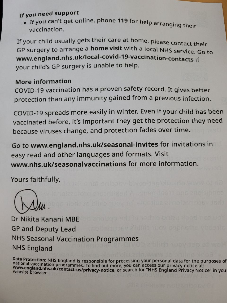 Letter currently being sent to parents of schoolchildren telling them: “Covid-19 vaccination has a proven safety record. It gives better protection than any immunity from a previous infection.”