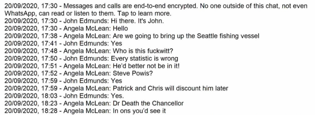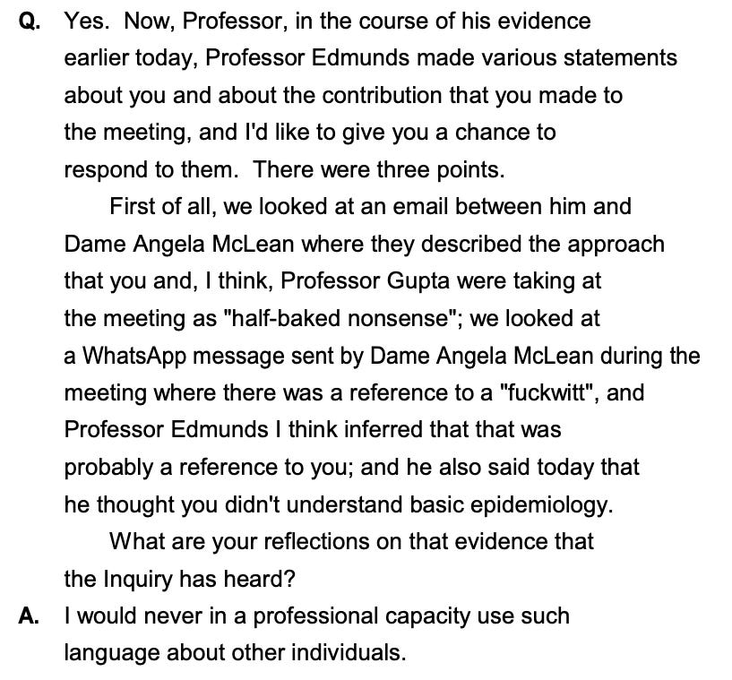 The context was the famous remote meeting with the then-PM. One person is an official, the other an adviser. The adviser (a modeller) was asked by the KC if the person elegantly identified by the official as “f***wit” was Carl, to which the modeller assented or seemed to. Being a modeller, you are never quite sure what is going on. Maybe this was a revenge act for showing what models are made of. Perhaps it was part of something a bit more sinister.