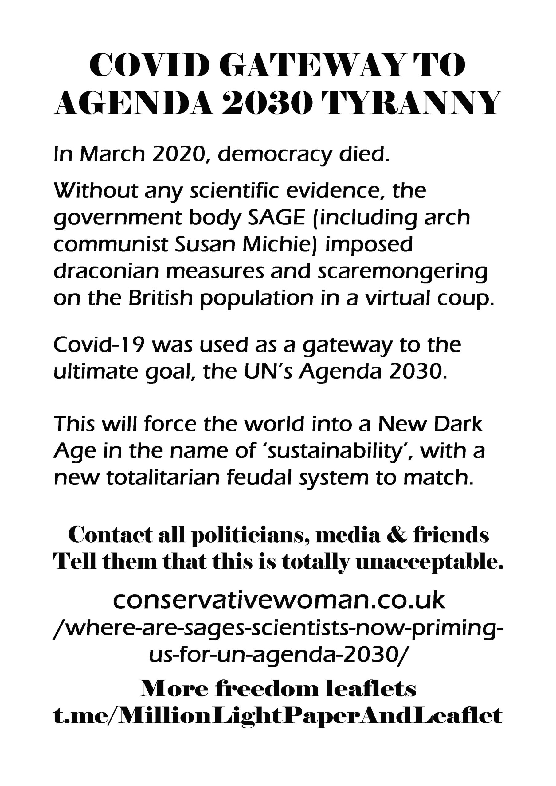 Covid Gateway to Agenda 2030 Tyranny – latest leaflet to print at home or forward to politicians, media, friends online.