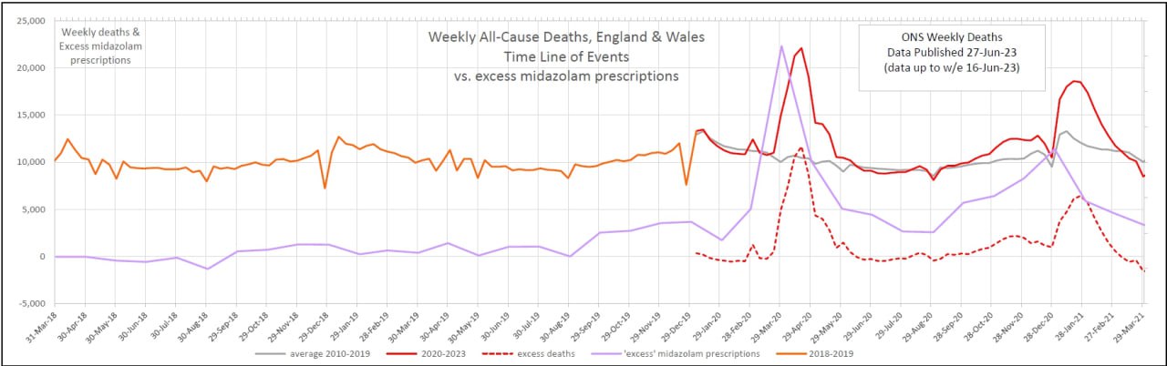I compared the amounts and dates of midazolam prescriptions with weekly deaths. In particular, I compared excess prescriptions with excess deaths. Correlation only started when the hoax pandemic started.