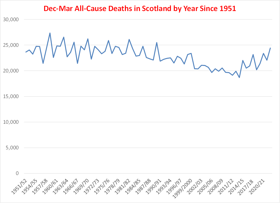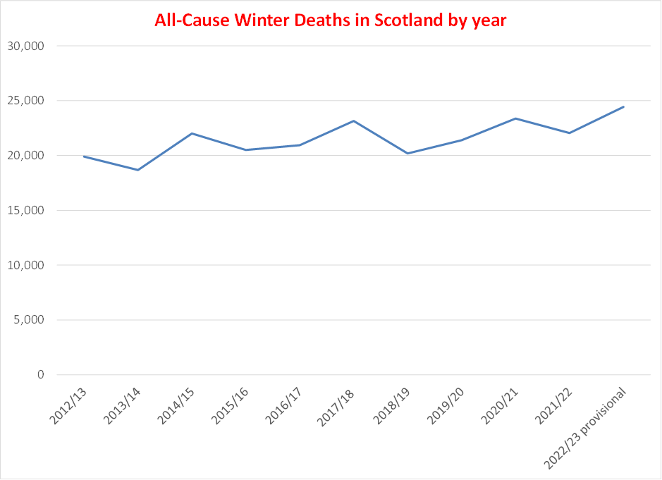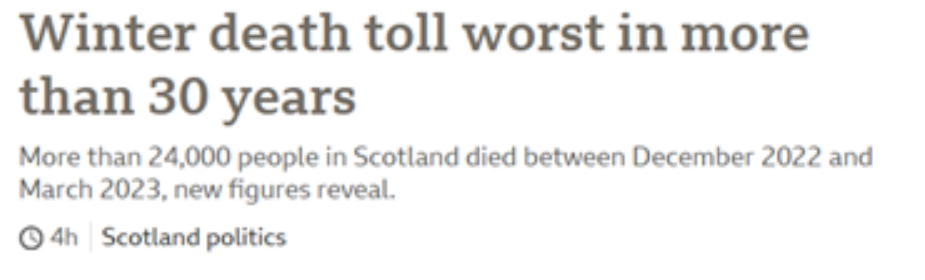The main news headline on the BBC Scotland pages on October 24th 2023 was: ‘Winter death toll worst in more than 30 years.‘ This refers to last winter, 2022-23. This is nearly three years after the ‘once in a century’ pandemic and two years after the population was jabbed to ‘end’ said pandemic.