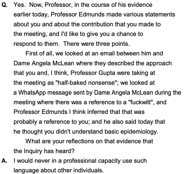 Firstly, we are deeply disappointed by the level of detail and tone adopted when Professor Heneghan gave evidence. In the preceding exchange with Professor Edmunds, both Mr. O’Connor and Professor Edmunds appear to have identified Professor Heneghan as a target for foul language, while the transcript mentioned someone else entirely without you intervening. Was this an arranged exchange? The text mentioned X, and Mr. O’Connor asked the witness, “does that refer to Y?” and the witness answered, “Yes”.