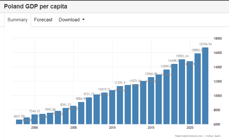 Poland had a slightly declining population over this period, in which its per capita GDP more than doubled