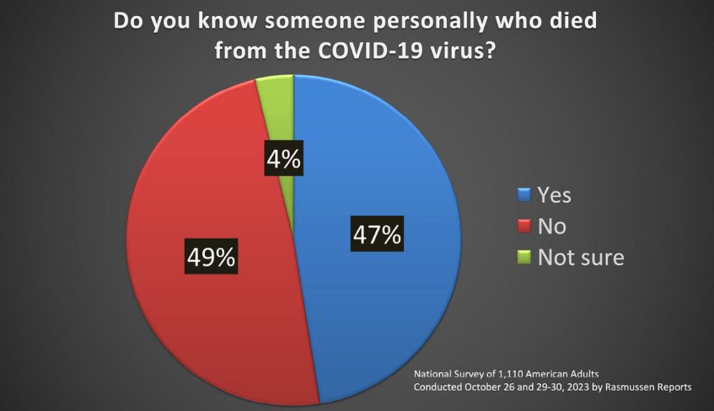 - 47% personally know someone who was killed by the Covid virus.