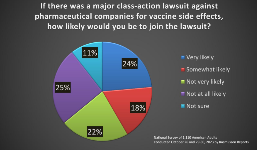 - 42% said it was somewhat likely or very likely they would join a major class-action lawsuit against pharmaceutical companies for vaccine side effects. That would make it the largest class action in U.S. history by a long shot.