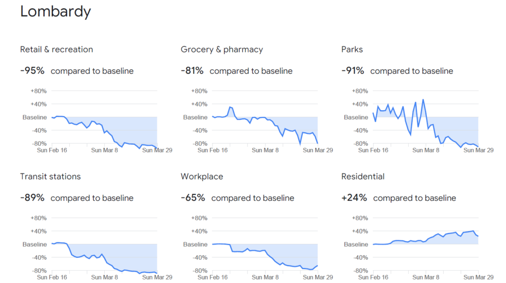 Google mobility data from Lombardy also show that there was no change in behaviour during the pre-lockdown period. While there was a drop in movement following the initial quarantine zone being imposed around a few towns on February 21st, there was no subsequent change that could explain why the outbreak slowed down in the week coming up to lockdown.