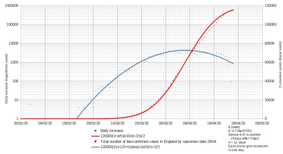At the beginning of the epidemic, the “case” numbers followed Farr’s Law. They were clearly not going to reach Ferguson’s estimates, if it was assumed that the mechanism of development of the epidemic was not significantly different to others. In particular, the infection had peaked before the first lockdown, especially if measured by “back working” to time of infection rather than time of case. Figures from Public Health England, published daily at the time. [NB: the sudden drop off in the last two days is an artefact of the daily reporting system and does not represent the final data for those days.]