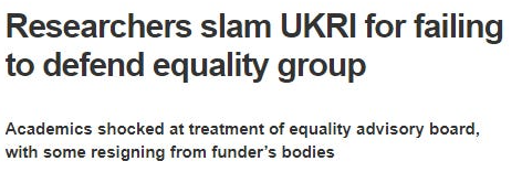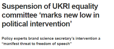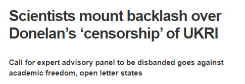 Apart from the obvious – that there is essentially no attempt being made to even nod to objectivity or concede that Donelan has her own side of the story – what is particularly interesting about these headlines is the way in which they present a fundamental opposition between academia itself and the politician in question. Note the monolithic and Manichean way in which the dispute is cast. Scientists mount a backlash. Researchers slam UKRI for not showing more of a backbone; academics are shocked. Policy experts position themselves against the Government. The sense of unity in opposition is palpable.