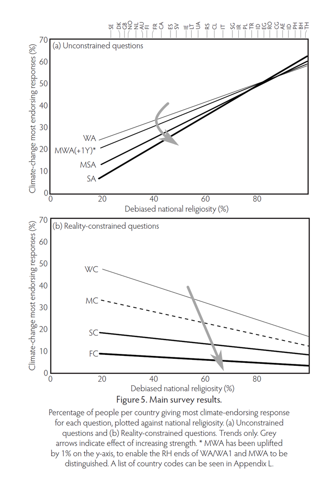 The key to understanding the inherently cultural nature of such attitudes is their very strong relationship with national religiosity, itself a purely cultural phenomenon. This relationship occurs because cultural entities tend to interact if they occupy the same social space for long enough. This has happened for religion and climate catastrophism. Hence national religiosity forms a kind of lens through which we can see the culture of catastrophism across nations; this lens is revealed by plotting the climate survey data series against national religiosity.