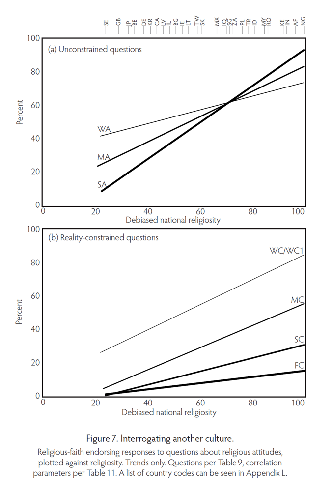This is by direct comparison. Any cultural entity should leave such a signature, so if we see the same pattern in survey data harvested from something that is inarguably a cultural entity like a religion, this makes it much more obvious that the climate survey data must come from the same kind of phenomenon. Religion is purely cultural, and survey data on purely religious (unconstrained and reality-constrained) questions produces the same kind of signature pattern that we see for attitudes to climate change. Figure 7 from my book illustrates this. The only (expected) difference is that, given there is only one culture involved, and so no alliance, all data must slope the same way. But the two response groups, the unconstrained pivot-point (where the lines cross) and the sinking of the reality-constrained responses with strength, are all fully in line with expectations. (Note: The questions are very basic, so all faiths react to them in the same manner. In both figures the country codes are examples, there isn’t space to fit them all in and different series represent different sub-groups of countries too).