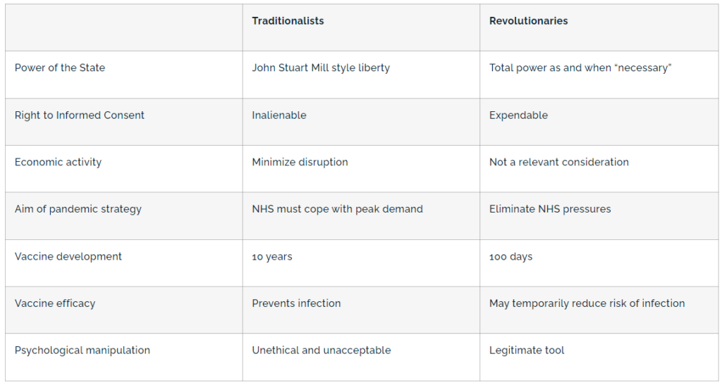 It makes more sense to look at the Covid ‘Inquiry’ in the context of redefining the role of the state and the citizen. To illustrate, I have spilt the protagonists into two main camps, the Traditionalists and the Revolutionaries. Due to differing worldviews those two groups will think differently about almost every subject, including the response to Covid.