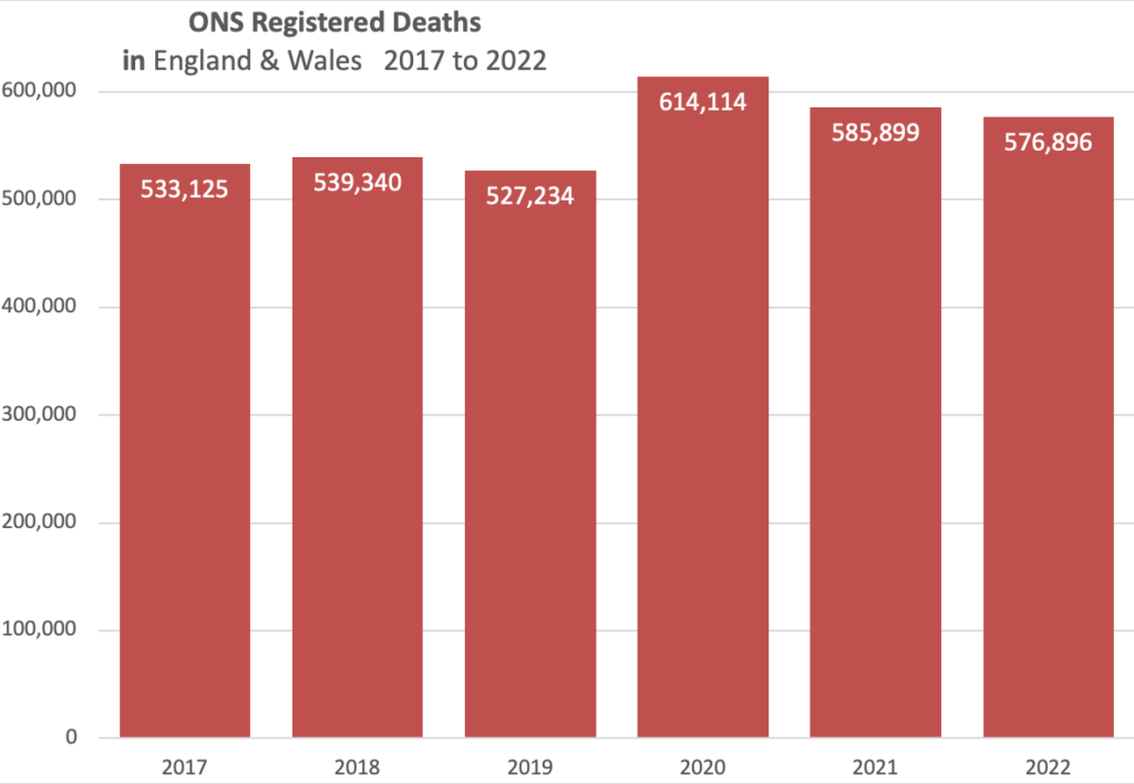 The number of deaths registered in 2022 in England and Wales was 6.2% above the five-year average.