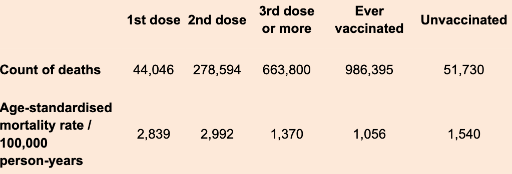 There’s something odd about these data: the age-standardised mortality rate per 100,000 person-years is higher for the first and second dose, but then the third dose or more drags it down – particularly the fourth dose looks like it does.