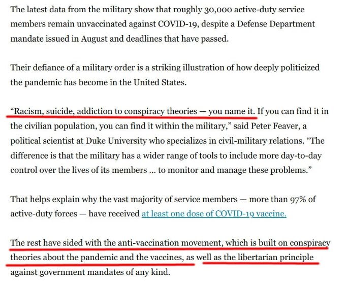 US military pitches are, along with the signing bonuses and benefits, touting “No COVID shot required to enter.” Others have pointed out that once the recruits are in, all bets are off. Trust surely is gone between the military and the citizenry as well as among individual troops indoctrinated with the woke anti-white, anti-male training. Will this resulting lack of military readiness stop the government from blundering into a war (or starting one to wag the dog or make a select few a lot of money)?