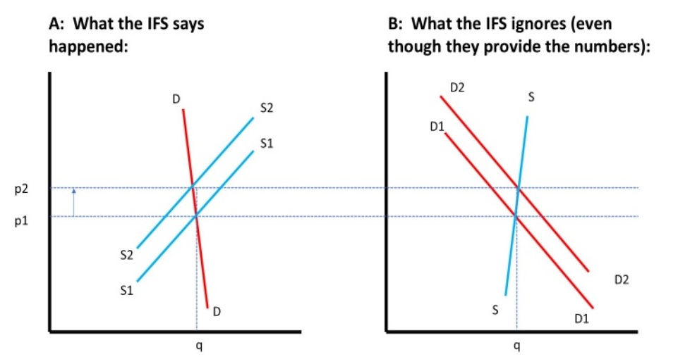 But we really don’t know enough to assume away the entire effect of increased demand, let alone make quantitative ‘best judgements’ a.k.a. guesswork. This is week 3 of A-level economics, and the IFS fails.