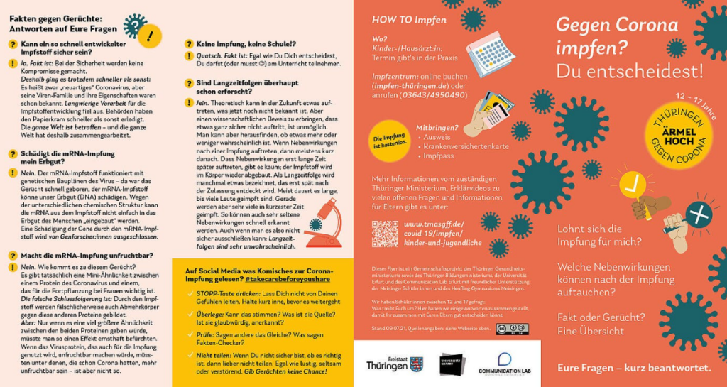 Ernst couldn’t say much about its contents because it came from on high. The flyer was funded by the Thüringen Health and Education Ministries, and masterminded by odious health communicator, Erfurt professor and villain-of-the-blog Cornelia Betsch. In later months, Betsch would go on to advise the Government on how to nudge German vaccine uptake higher. We are dealing with the upper reaches of the German vaccinator-industrial complex here, in other words. The flyer was designed according to interviews its authors conducted with teenagers at the Henfling Gymnasium in Meiningen, for the purposes of figuring out how best to manipulate kids into getting excited about vaccines.