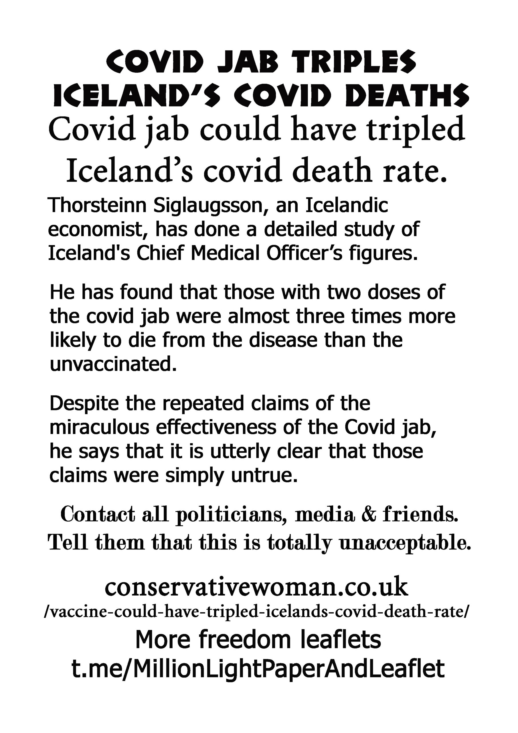 Covid Jab Triples Icelands Covid Deaths – latest leaflet to print at home and deliver to neighbours or forward to politicians, media, friends online.