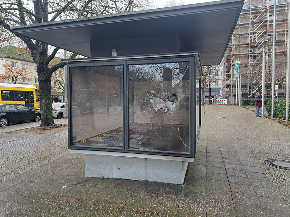 ‘Jewish Moabit’ stickers on the glass panes were ripped off, probably by antisemites.