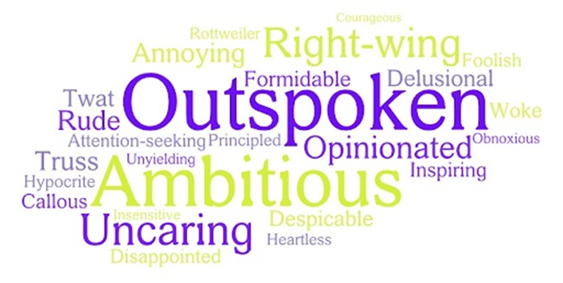 When I asked respondents to summarise Braverman in a few words, Left-liberal critiques tended to paint her as a nasty racist; conservative respondents who worry about immigration but think she should be sacked tend to see her as rude, ambitious, uncaring and obnoxious, as the word cloud below reveals. When asked why they favoured her removal, such voters were mainly concerned about her undermining Rishi Sunak, the party or the police’s authority. Mainstream media coverage may have shaped the perceptions of such voters.