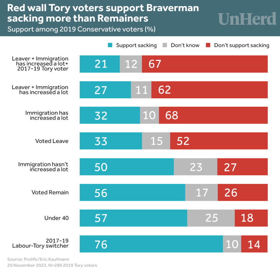 Voters are increasingly worried about immigration as the scale of Tory failure on the issue becomes apparent, but even so there was wide support for the sacking of Suella Braverman, including among Tory voters. Eric Kaufmann investigates this apparent paradox and reports his findings in UnHerd.