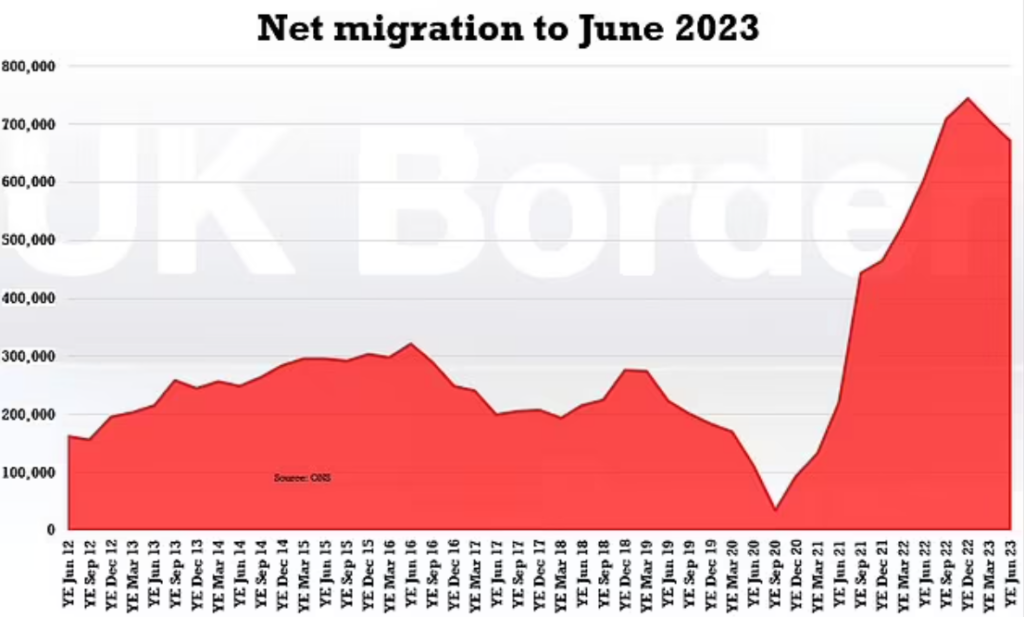 The figures for the year to June 2023 hit 672,000, up from 607,000 in the previous 12 months but slightly down on the revised December record, driven by a fall in humanitarian arrivals, including those from Ukraine and Hong Kong.