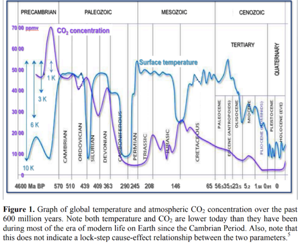 If this graph of global temperature and CO2 concentration over the past 600 million years is approximately valid, it shows two things: