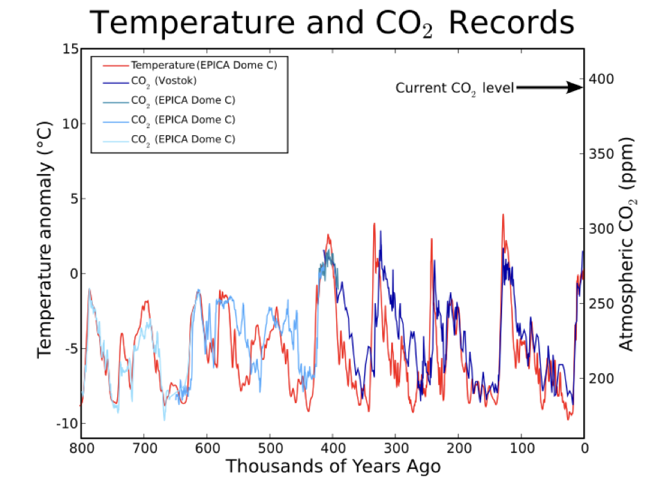 - At this time scale CO2 concentration and temperature are strongly correlated: CO2 and temperature go up and down together.