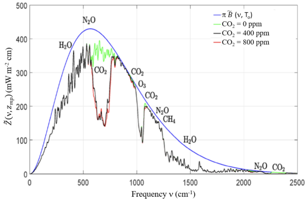 The blue bell-shaped curve shows the amount of solar energy flux (at different wavelengths, x-axis) radiated to space from an earth with no atmosphere. (Most is in the infrared region 400-1000 or so.) The green line is the flux with an atmosphere with no CO2 but with all other greenhouse gases at their standard concentrations. The black line is for all greenhouse gases, CO2 included, at their standard concentrations. The red line is for twice the standard concentration of CO2 (400 to 800 ppm) but with all the other greenhouse gases unchanged.