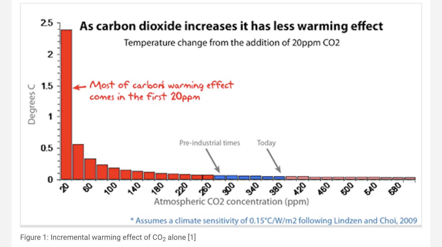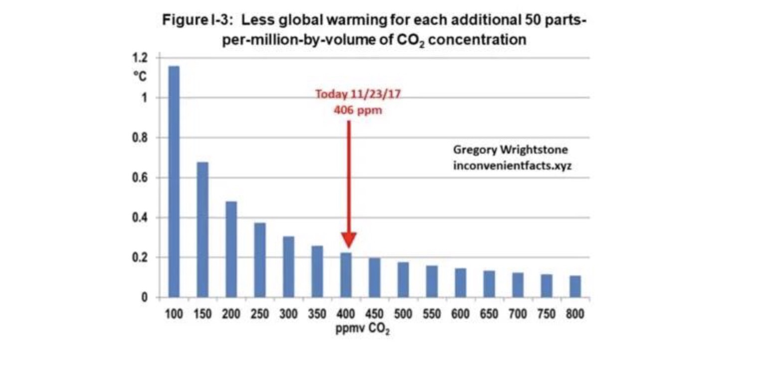 You are right, of course, in that precision is bogus. The error bars in the IPCC reports are bigger than the change they claim to be able to predict. But the general point is valid. Steve Koonin likened it to brushing paint over a window. First coat – some streaks of light get through. Second, not much. Third, none. Subsequent coats – no difference. We don’t have to put up with this “co2 is a pollutant” lie.