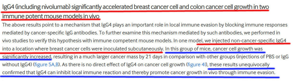 The study details Wang et al.’s multidimensional investigation of IgG4 in a wide array of patients with cancer and tissues with both in vitro and in vivo experiments. Again, this research was done in 2020, well before the effects of Covid vaccines on IgG4 could be seen.