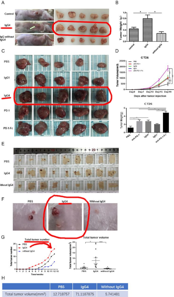 I illustrated the image scientists provided and circled larger tumors – and tumor size increases – they found to happen after IgG4 injections: