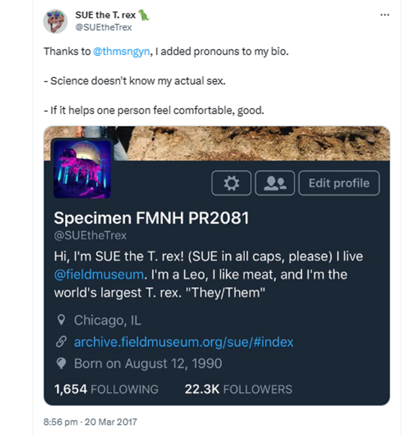 A few months later, SUE was being moved to another exhibition space, which online activists realised meant it would need all its labels rewritten. Queer lobbyists contacted the museum demanding the T. rex now adopt gender-neutral pronouns permanently on the grounds that “Misgendering SUE didn’t just misrepresent the dinosaur, it risked invalidating the credibility SUE’s pronouns had given to nonbinary individuals.”