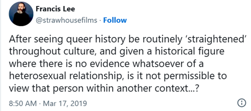 Why is it, Lee asks, that we view absence of evidence for any sexuality as confirmation of Mary Anning’s heterosexuality? … The fossils that Mary discovered over the course of her life lay physically and metaphorically beneath the surface; they needed to be literally dug up and examined in order to be understood. In light of how queer lives are often buried or erased over the course of history… we must think beyond conventional ideas about the past and open our minds to what lies hidden beneath the surface. To queer the past is not to compromise its veracity, but to recognise that the past is a shifting, dynamic variable which can continue to yield revelations and thereby influence the present.