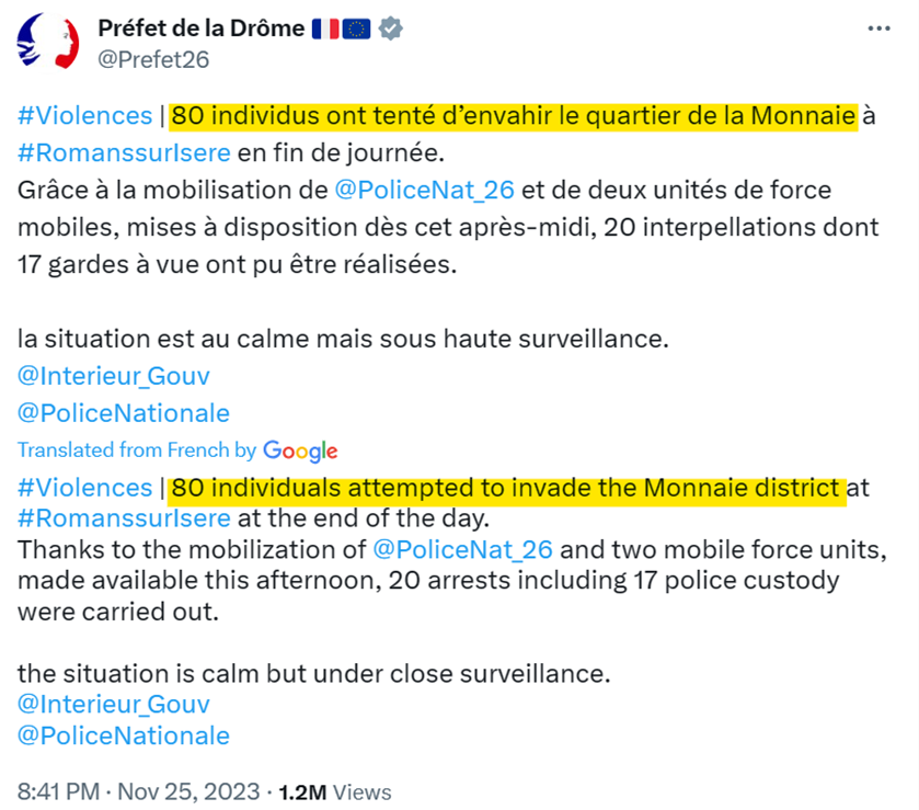 “Remarkably, within just two days of the events, on Monday, six of the ultimately 24 “ultra-Right” protestors arrested would already be sentenced to prison terms of from six to 10 months! It should be noted that none of the suspects arrested in connection with the Crépol attack have yet to be charged.”