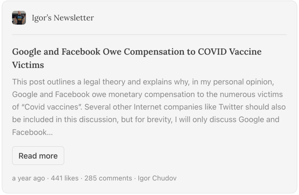 Over a year ago, I expressed hope that, someday, Google and Facebook will face covid vaccine lawsuits for conspiring to hide the dangers of Covid vaccines from the public.