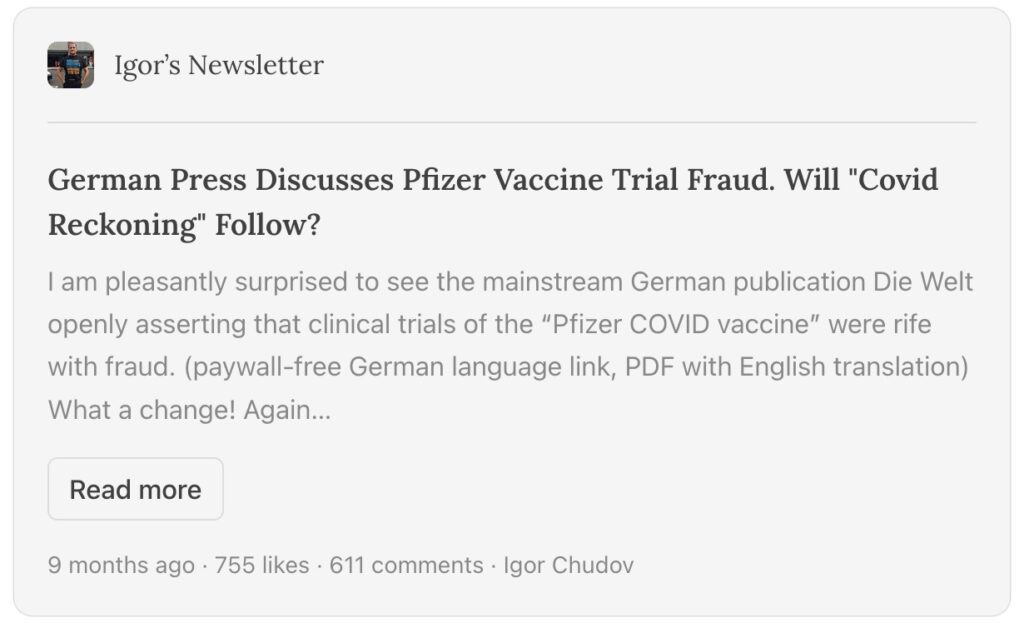 I wrote this in January (Pfizer closed at $29 yesterday): Apart from bragging when things are going my way, what really prompts me to write is my one position which shows a slight loss – I’m short Pfizer at $47.20 ($47.70).I’m a vaccine sceptic and even more a covid vaccine sceptic, so I’m definitely biased anti-Pfizer. That said, I’m happy to speculate against my own biases for the sake of money and self-discipline. I sense a global upswell against the covid vaccines right across the medical profession and in politics. Of course it’s still suppressed by the legacy media and most social media, but the cracks are getting bigger. My thesis is that Pfizer is at risk for many billions in fines and reparations for mrna vaccine harms. The vaccine makers have legal immunity against such claims, but that would be jeopardised in the event of fraud being shown and there is evidence of non-disclosure in the early studies used for emergency authorisation. Moreover Pfizer’s political cover is weaker and weaker with the retirement of Fauci and the absurdity of Biden and the loss of credibility of the CDC and FDA. Ron De Santis is on my side of this… Read more »