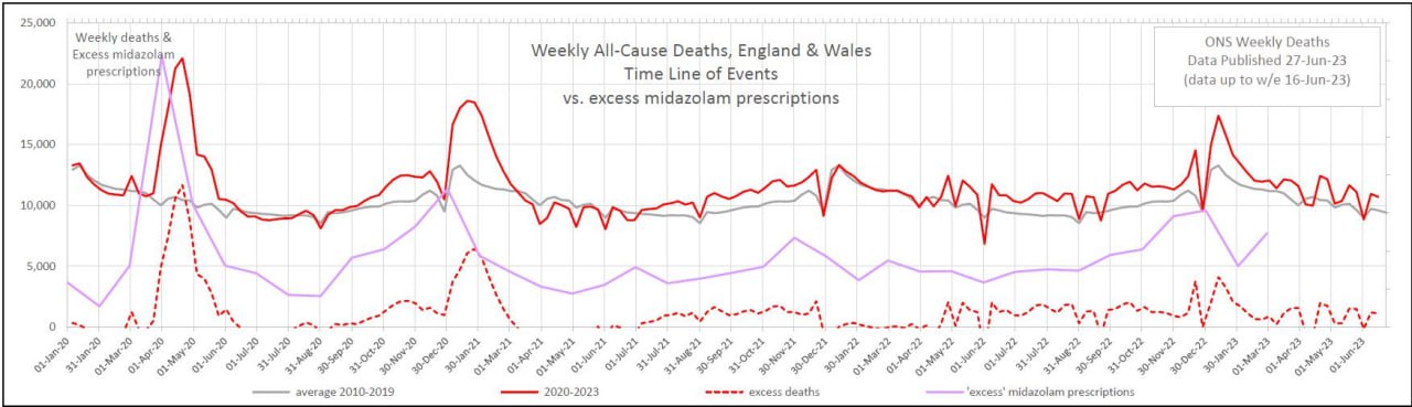 Are we still talking about so-called ‘covid deaths’? Dare we not mention the excessive midazolam prescriptions that preceded the huge number of excess deaths? The ‘covid deaths’ with an average age 3 years later than all-cause mortality? The ‘covid deaths’ that appeared to be similar to a real pandemic’s Gompertz curve?